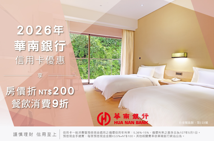 - 活動期間刷華南銀行信用卡訂購2026年度一泊二食專案,現折房價NT$200/間。