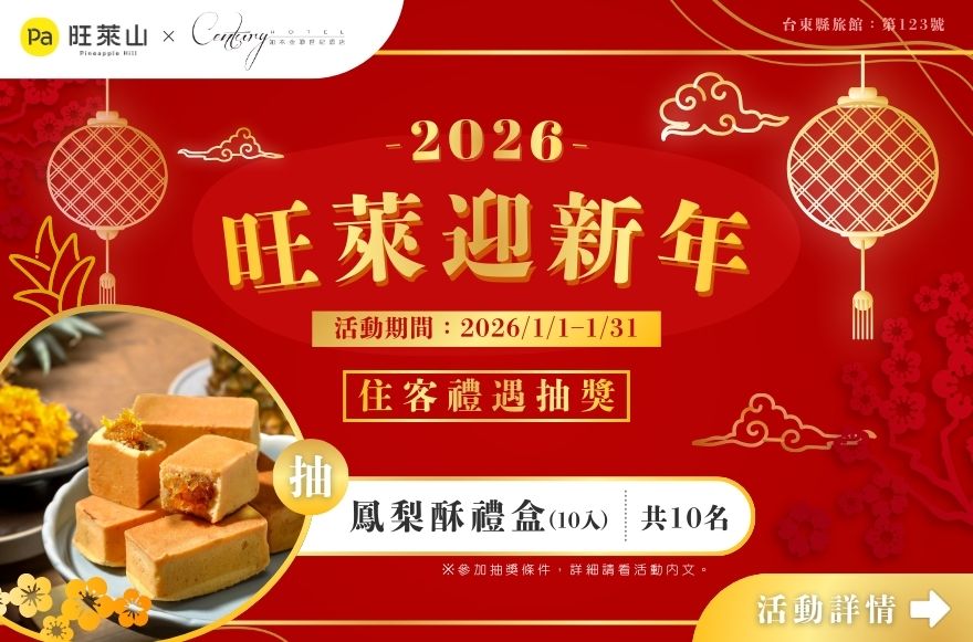 〈旺萊迎新年〉住宿抽獎活動|知本金聯世紀酒店 〈旺萊迎新年〉住宿抽獎活動 2026/01/01 - 2026/01/31 最新消息 【旺萊迎新年】迎新納福,好運旺旺萊 在2026/1/1~1/31活動期間,凡是入住飯店2晚或2次(含)以上的客人 即可獲得「旺萊迎新年活動」抽獎機會,讓新年旅行更充滿期待 超讚活動獎品在等你: 旺萊山《鳳梨酥10入禮盒》-抽10位 讓每晚住宿,都是一場幸福儀式感 一起享受金好時光吧! 【本飯店保留活動變更、修改及最終解釋權利|其他未盡事宜依飯店說明為準】 〈元氣回甘‧滴滴暖心〉知本金聯 x 芳茲 〈東岸的海味誘惑續章〉知本金聯 x OKmart活動 常見問題 Q&A Q:贈送門票如何提供? A:贈送票券於辦理入住時提供,可於入住期間使用。 Q:有哪些免費設施? A:健身房與兒童FUN電樂園、泳池等免費設施,詳情請見設施介紹:https://centuryhotel.com.tw/zh/equip。 Q:如何預約接送服務? A:請於入住前3天電話預約,台東火車站/機場單程NT$250/人,知本火車站單程NT$150/人。