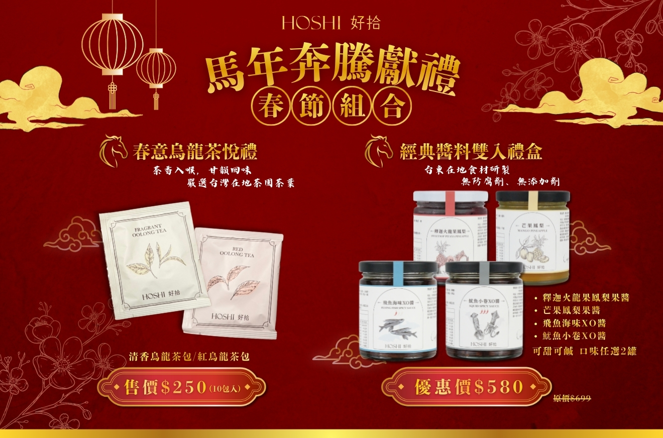 〈馬年奔騰獻禮〉春節好禮組合|知本金聯世紀酒店 〈馬年奔騰獻禮〉春節好禮組合 2026/01/23 - 2026/02/10 餐飲美饌 【經典醬料雙入禮盒】優惠價NT$580/盒 (口味任選2瓶) 釋迦火龍果鳳梨果醬 無香料、無色素、不添加防腐劑,使用天然食材並嚴選甜香濃郁的台東大目釋迦、紅肉種太麻里火龍果及鹿野鳳梨,以完美比例搭配出甜而不膩的口味,完美碰撞出新奇滋味,在口中蔓延。 ※本產品含有鳳梨,不適合對其過敏體質食用。 ※保存期限:未開封效期三個月,開封後需冷藏保存。 芒果鳳梨果醬 無香料、無色素、不添加防腐劑,使用天然食材並特選被譽為芒果界LV的台東夏雪芒果與果香濃郁的愛文芒果,搭配酸甜可口的鹿野金鑽鳳梨,提升味蕾豐富感,酸甜交織的果香之旅在舌尖上舞蹈。 ※本產品含有芒果、鳳梨、奶粉及其製品,不適合對其過敏體質食用。 ※保存期限:未開封效期三個月,開封後需冷藏保存。 飛魚海味XO醬 經典款海味,拌飯拌麵好夥伴,使用蘭嶼飛魚乾搭配微辣鹹香的調味及用料扎實,宛如遙遊大海之中。讓簡單料理美味升級,便利又實用的好選擇。 ※本產品含有芝麻、大豆、蝦、魷魚、魚類及其製品,不適合對其過敏體質食用。 ※保存期限:未開封效期一年,開封後需冷藏保存。 魷魚小卷XO醬 嗜辣老饕、無辣不歡首選,以黃金比例加入朝天椒、開陽、花椒油等佐料,與富岡魷魚小卷交織出辣感十足的海味奇緣。搭配飯菜超開胃,辣香俱全,大呼過癮。 ※本產品含有芝麻、大豆、蝦、魷魚、魚類及其製品,不適合對其過敏體質食用。 ※保存期限:未開封效期一年,開封後需冷藏保存。 【春意烏龍茶悅禮】優惠價NT$250/盒 (10包入/口味二選一) 清香烏龍茶包 低度焙製,保留茶葉原始清香。 口感清爽淡雅,每一口都是剛剛好的日常節奏。 紅烏龍茶包 細緻焙製,呈現紅烏龍特有的厚實茶感。 香氣溫潤深沉,入口醇厚,餘韻悠長,適合靜靜品飲的時刻。 【本飯店保留活動變更、修改及最終解釋權利】 〈SPY×FAMILY間諜家家酒〉主題房 〈知本暖湯輕旅行〉旅行路線 常見問題 Q&A Q:贈送門票如何提供? A:贈送票券於辦理入住時提供,可於入住期間使用。 Q:有哪些免費設施? A:健身房與兒童FUN電樂園、泳池等免費設施,詳情請見設施介紹:https://centuryhotel.com.tw/zh/equip。 Q:如何預約接送服務? A:請於入住前3天電話預約,台東火車站/機場單程NT$250/人,知本火車站單程NT$150/人。