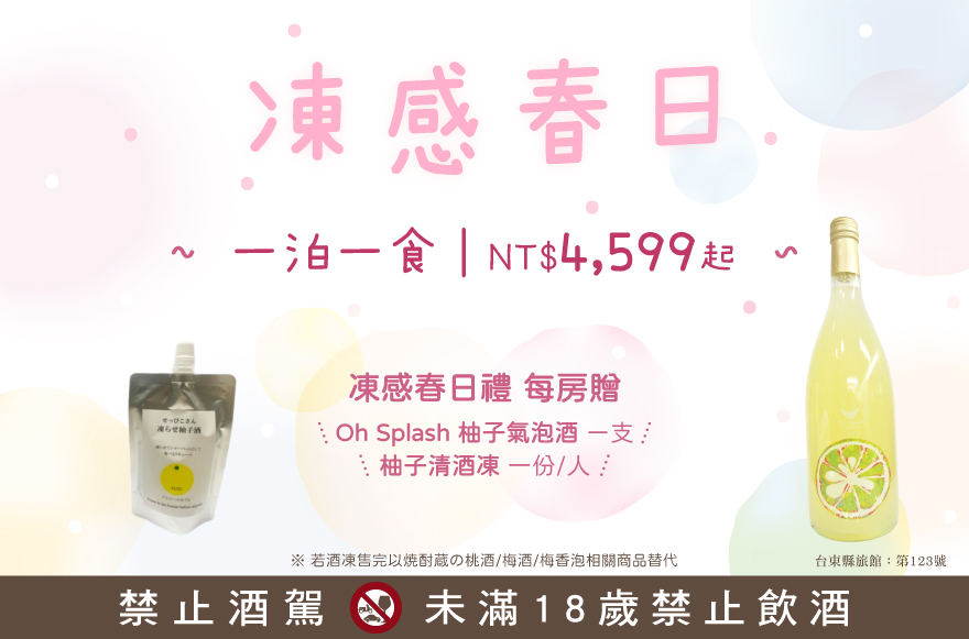 〈凍感春日〉春日微醺的清涼|知本金聯世紀酒店 〈凍感春日〉春日微醺的清涼 2026/04/21 - 2026/06/30 住宿優惠 專案內容: 1. 客房住宿-1晚 2. 四季自助早餐-每人乙客 3. 凍感春日禮: 贈每房Oh Splash 柚子氣泡酒1瓶 贈每房每人柚子清酒凍1份(若酒凍售完以燒酎藏の桃酒/梅酒/梅香泡相關商品替代) 4. 健身房、兒童FUN電樂園等免費設施任意使用(實際開放及使用規範依現場情況為主) 注意事項 : 本專案不得與其他優惠並用,不適用商務合約優惠。 山水系列房型無提供加床服務。 【本飯店保留專案變更、修改及最終解釋權利】 〈春季限定〉餐飲優惠 常見問題 Q&A Q:贈送門票如何提供? A:贈送票券於辦理入住時提供,可於入住期間使用。 Q:有哪些免費設施? A:健身房與兒童FUN電樂園、泳池等免費設施,詳情請見設施介紹:https://centuryhotel.com.tw/zh/equip。 Q:如何預約接送服務? A:請於入住前3天電話預約,台東火車站/機場單程NT$250/人,知本火車站單程NT$150/人。