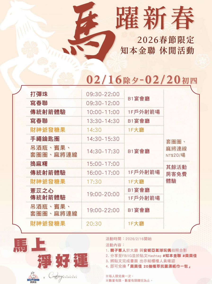 知本金聯世紀酒店 農曆春節限定活動休閒活動飯店外觀及大廳商務中心露天泳池/溫泉池射箭場桌球室瑜珈室兒童FUN電樂園SWITCH娛樂室橋藝室健身房 營業時間 2/16~2/20 【為提供安心使用及體驗,實際開放情況需以現場狀況為主,敬請見諒】